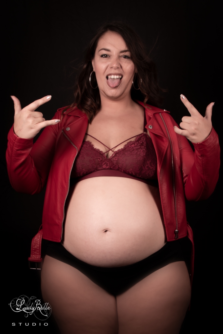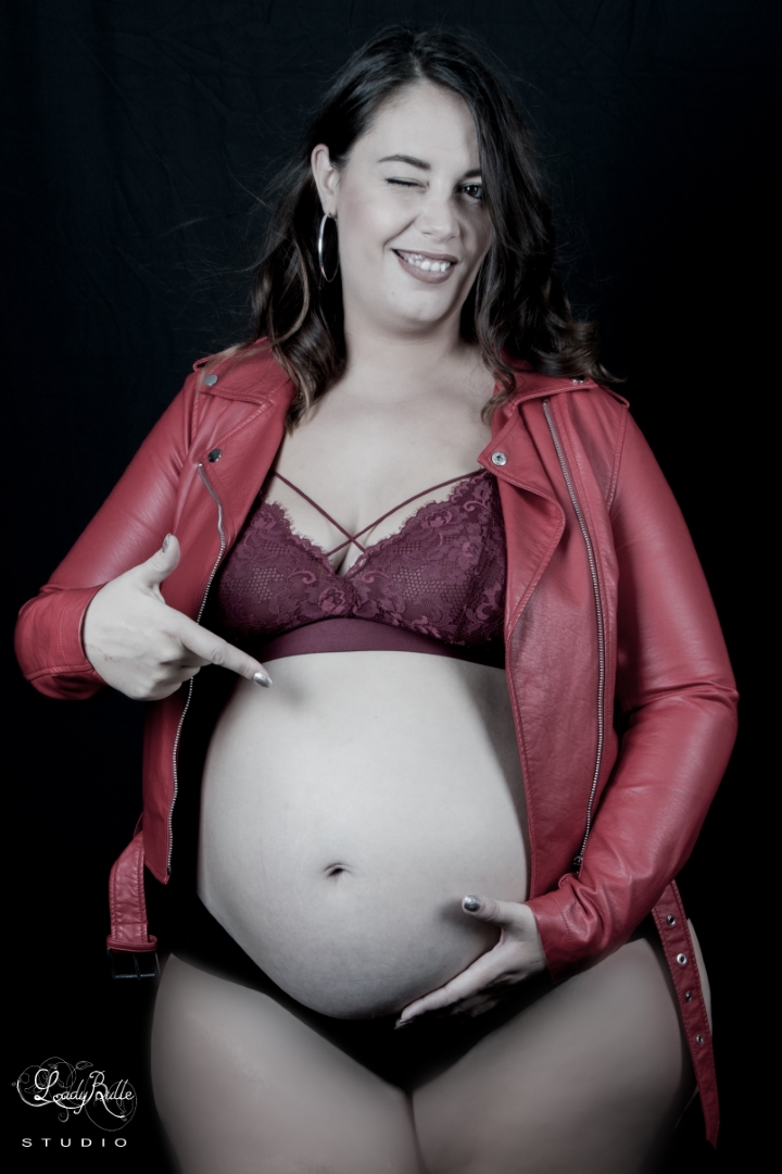 Nous avons commencé par regarder les différentes tenues et choisir celles que nous préférions. Nous avons d’abord opté pour un déshabillé noir afin de mettre le ventre bien en avant. Pis nous avons choisi une robe blanche avec une couronne de fleurs pour un côté bohème et enfin un perfecto rouge pour un côté rock’n roll.