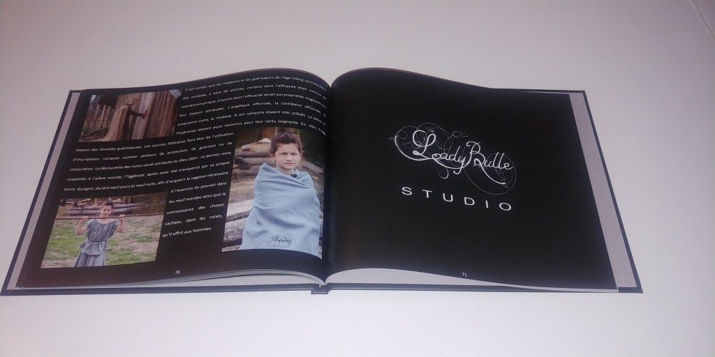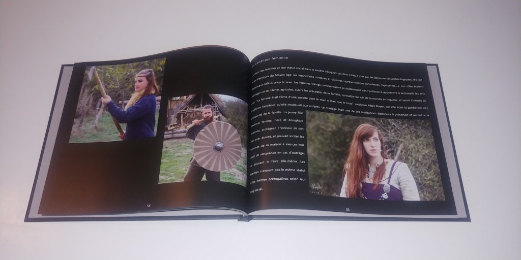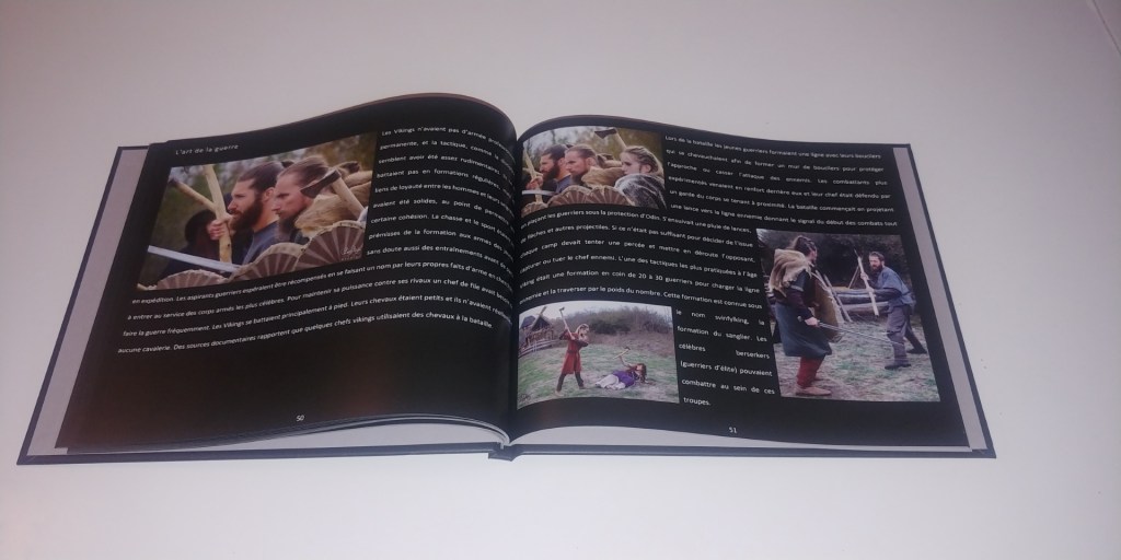 Je vous montre quelques photos du livre (désolée pour la qualité elles ont été faites avec mon téléphone). Il faut savoir qu’il fait 25 cm x 20 cm et 78 pages. Ce n’est pas un livre « Viking Fantaisy » mais un livre qui se veut réaliste vérifié par des historiens dans un esprit historique. Le livre comprend une première partie où je mets en perspective la série « Vikings » avec les faits historiques tels que les historiens, archéologues, chercheurs ont réussi à les réunir à l’heure actuelle et une seconde partie plus historique sur l’histoire, les guerres, la condition des femmes qui était bien plus avancée que dans de nombreux autres pays à l’époque (et encore actuels), les rites, … et beaucoup d’autres choses.