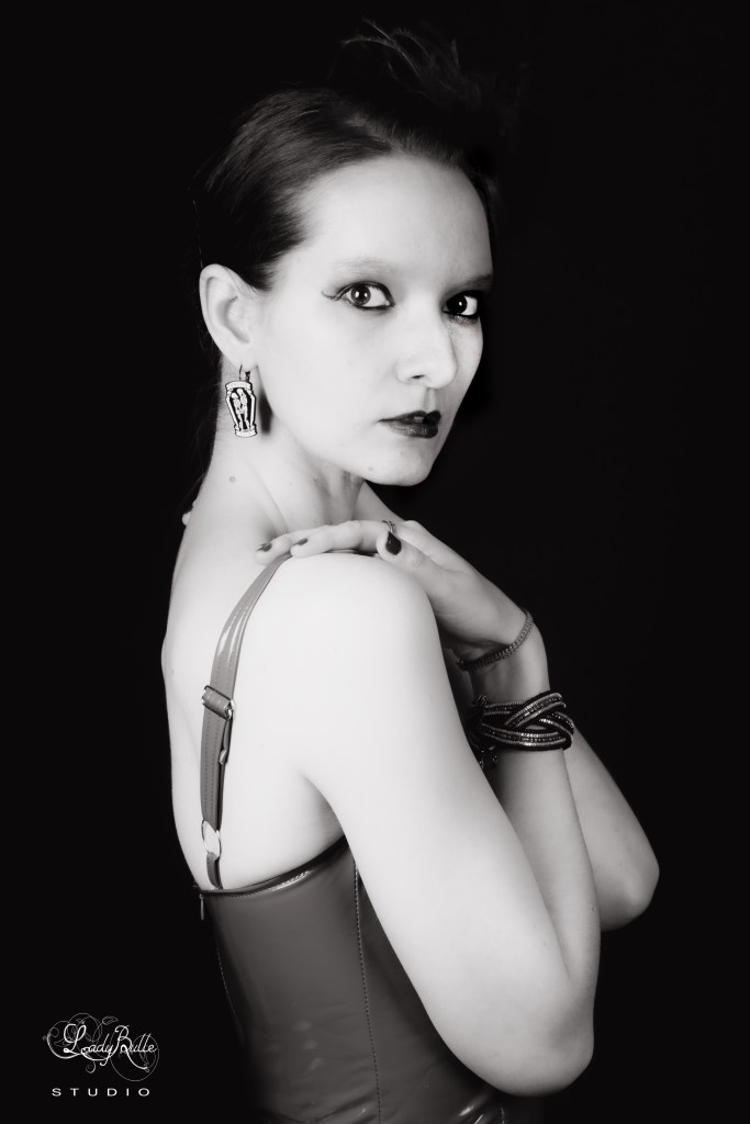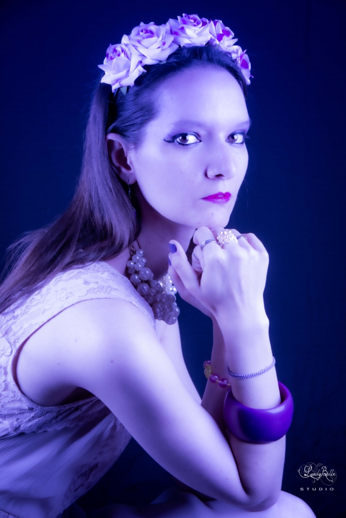 Le thème « Deep Purple » a été réalisé en studio. Pour celui-ci, Mélanie avait apporté une tenue vinyle violette, talons violets. Nous avons opté pour un décor style boudoir et utilisé des bijoux de ma partenaire Asolirow.